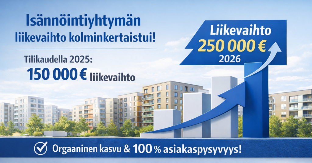 Isännöintiyhtymä Oy:n liikevaihto nousi tilikaudella 2025 noin 150 000 euroon, mikä tarkoittaa liikevaihdon kolminkertaistumista edellisvuoteen verrattuna. Tasainen kasvu on saavutettu orgaanisesti ja yrityksen liiketoiminta on kannattavaa. Kasvu perustuu hallittuun asiakasmäärän… Lue lisää: Isännöintiyhtymän liikevaihto kolminkertaistui tilikaudella 2025 - Isännöintiyhtymä nyt TikTokissa!